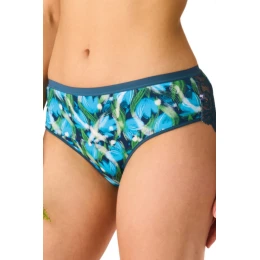 Dámske nohavičky klasického strihu, vyrobené z mäkkého a elastického materiálu, ktorý sa dokonale prispôsobí postave. Výrazný kvetinový vzor v odtieňoch modrej a zelenej farby dodáva bielizni svieži, moderný charakter. Jemná čipka umiestnená na boku dodáva eleganciu a ľahkosť, pričom zachováva plné pohodlie pri nosení. Ideálna každodenná voľba pre ženy, ktoré rady kombinujú pohodlie s originálnym štýlom.