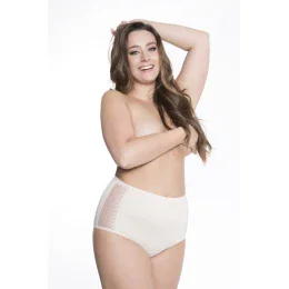 Dámske nohavičky s vyšším pásom. Na bokoch majú ozdobné krajkové všivky s geometrickým vzorom. 89% polyamid, 10% elastan, 1% bavlna.