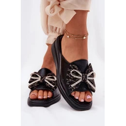Klapki Damskie Na Koturnie Z Kokardą Czarne Moonzella