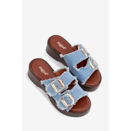 Dámské nazouváky vyrobené z textilního materiálu jsou stylovým a pohodlným návrhem na každý den. Model má dva pásky se zlatými přezkami, které zvýrazňují módní vzhled. Umístěny na platformě. Měkká vložka zvyšuje pohodlí i při delším nošení. Nazouváky jsou ideální pro letní stylizace, spojující funkčnost s elegantním vzhledem. Při výběru velikosti se řiďte tabulkou velikostí.