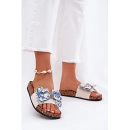 Stylové pantofle s korkovou podrážkou se vyznačují profilovanou stélkou. Jsou vyrobeny z eko semiše a textilního materiálu. Přední část zdobí mašle. Pantofle jsou univerzální a skvěle se hodí pro každodenní aktivity, práci nebo nakupování. To je ideální volba na letní dny! Při výběru velikosti se řiďte tabulkou velikostí.