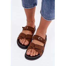 Dámské pantofle s pásky a zlatým sponou Hnědé Selorina