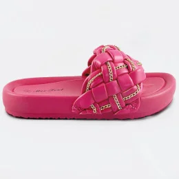 Dámske šľapky vo fuchsijovej farbe so zapleteným pásikom a retiazkou (AE120)