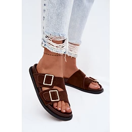 Dámské pantofle z imitace semiše s zlatými přezkami čokoládové model 22102893 - Boto