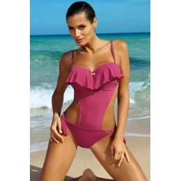 Vrchní a spodní část plavek jsou spojené širším páskem. Košíčky modelu jsou vytvarované. Mezi košíčky je pěkná ozdobná mašlička. Dekolt je olemovaný stylovým volánkem. Model má svislé boční kostice. Ramínka je možné nastavit i odepnout. Vzadu se model zapíná pohodlným klipem.