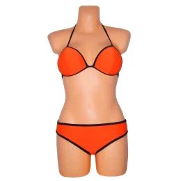 Dámské dvoudílné plavky opalovací, bikiny s polstrovanými košíčky (polstrování nelze odejmout). Plavky jsou vyrobeny v módní oranžové barvě a doplněny černými lemy, které podtrhují kontury obou dílů plavek. Podprsenka se zavazuje tkanicemi na zádech a za krkem.