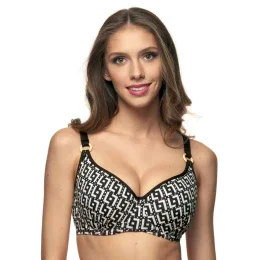 Dámske plavky Fantasy z novej kolekcie Giani. Vrchný diel dámskych plaviek v elegantnom čierno-bielom prevedení má jemne vystužené košíčky s kosticami a vysoký stred. Strih košíčkov a široký obvod podprsenky s bočnými elastickými kosticami zaručí pevné a pohodlné nosenie a zároveň vytvaruje krásny a plný dekolt. Podprsenka má pevne všité, nastaviteľné ramienka, ktoré majú úzke kovové plastové krúžky. Zadné zapínanie je ukončené pevne všitou sponou na zaháknutie. Plavky je možné ľubovoľne kombinovať spodný a vrchný diel v poradí podľa uvedených veľkostí jednotlivých dielov. Plavky sú českej výroby a kúpou tohto výrobku podporíte výrobu českého odevného priemyslu.
