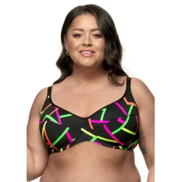 Dámske plavky Fantasy z novej kolekcie Neon. Vrchný diel dámskych plaviek s atraktívnym vzorom má nevystužené košíčky s kosticami. Strih košíčkov je členený a stredne široká podprsenka s kosticami so širšou zadnou časťou pre lepšiu podporu poprsia zaručí pevné a pohodlné nosenie tohto modelu. Ramienka nie sú odopínateľné, sú pevné. Zapínanie na chrbte je širšie. Pri týchto plavkách môžete ľubovoľne kombinovať spodný a vrchný diel v poradí podľa uvedených veľkostí jednotlivých dielov. Plavky sú českej výroby a kúpou tohto výrobku podporíte výrobu českého odevného priemyslu.