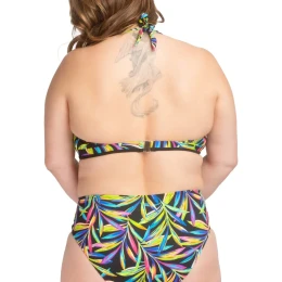 Dámské plavky Fantasy. Dámský horní plavkový díl má bezkosticové vyztužené košíčky s vyjímatelnými výztuhami. Košíčky mají trojúhelníkový tvar, pomocí tkaničky můžete regulovat vzdálenost košíčků od sebe. Ramínka jsou součástí košíčků a přechází do mašličky na vázání za krkem. Obvod podprsenky je v bocích vyztužen flexibilními silikonovými kosticemi, které se Vám přizpůsobí, spodní část obvodu je spevněna. Zapínání je umístěno v zadní části obvodu na kovovou sponu. U těchto plavek lze libovolně kombinovat spodní a horní díl v dané kolekci.