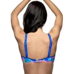 Dámské plavky Fantasy z nové kolekce Miki. Dámský horní plavkový díl v zářivém barevném provedení má jemně vyztužené nařasené košíčky s kosticemi a nižší střed. Plavky lemuje úzký proužek v modré barvě. Střih košíčků a středně široký obvod podprsenky s bočními pružnými kosticemi Vám zaručí pevné a pohodlné nošení. Podprsenka má nastavitelná ramínka, která lze jednoduše zapnout, nebo uvázat za krk. Zadní zapínání je ukončeno pevně všitou sponou na záháknutí. Plavky jsou české výroby a koupí tohoto výrobku podpoříte produkci českého oděvního průmyslu.