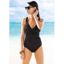 Jednodielne plavky od talianskej značky Siélei. Plavky majú všitú vypchávku do podprsenky, ktorá má v spodnej časti gumičku. Ramienka sú pevne všité, dĺžka nie je nastaviteľná. Zadná časť má hlbší výstrih. Predná časť má čiastočný záhyb zužujúci sa do boku s kruhovou aplikáciou v najužšom mieste, takže plavky opticky zoštíhľujú postavu. Tomu napomáhajú aj zlaté zvislé pruhy a vertikálne riasenie látky. Celé plavky sú podšité.
