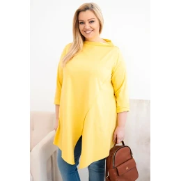Táto dámska blúzka plus size má moderný, asymetrický strih, ktorý dodáva siluete ľahkosť a štýl. Je vyrobená z mäkkej, elastickej bavlny, čo zaručuje pohodlie pri celodennom nosení. Model má nápadný, nezvyčajný predný výstrih a ohrnuté rukávy, ktoré zdôrazňujú voľný, módny charakter blúzky. Je ideálna na každodenný styling, a to k legínam aj k jednoduchým nohaviciam.
