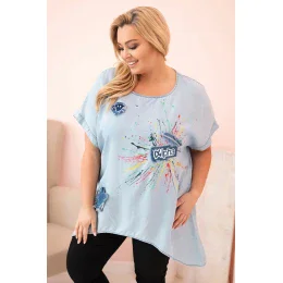 Ak máte radi originálny štýl a každodenné pohodlie, táto dámska blúzka s krátkymi rukávmi a výraznými aplikáciami vás určite zaujme. Je vyrobená z mäkkého, priedušného lyocellu, ktorý zaručuje pohodlie aj počas horúcich dní. Umelecké potlače pripomínajúce záblesky farieb a módna aplikácia "Alpha" jej dodávajú jedinečný charakter. Asymetrický lem - vpredu kratší a vzadu dlhší - opticky zoštíhľuje postavu a dokonale sedí každej postave. Jemné odreniny a ozdobné aplikácie vytvárajú ležérny mestský efekt, ktorý je ideálny na prechádzky, nákupy alebo neformálne stretnutie s priateľmi. Určené pre ženy nosiace veľkosť Plus Size - XXL, XXXL a väčšie.