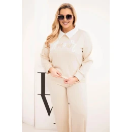 Štýlová a mimoriadne pohodlná dámska športová súprava plus size je ideálnou ponukou pre ženy, ktoré si cenia pohodlie a módny vzhľad. Súpravu tvorí mikina s efektným golierom a nápisom na prednej strane, ako aj nohavice so širokými nohavicami a elastickým pásom so šnúrkou na úpravu.