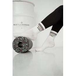 Dámské ponožky vyrobené z bavlny jsou ideální kombinací pohodlí a módního vzhledu. Pásky umístěné v horní části jim dodávají sportovní charakter a nápis představuje výrazný stylový akcent. Elastické a příjemné na dotek, skvěle se přizpůsobí na noze a zajišťují pohodlí při každodenním nošení.