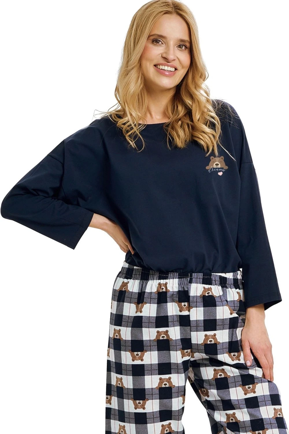 Dámské pyžamo 3441 01 Astrid TARO - z vysoce jakostní bavlny - tmavě modré tričko s dlouhými rukávy - kulatý výstřih - zdobené potiskem na přední straně - dlouhé volné nohavice s potiskemMateriálové složení: 100% bavlna
