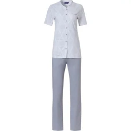 Svetlošedé dámske pyžamo so zapínaním na gombíky od značky Pastunette.pyžamové tričko má krátke rukávy. Dlhé pyžamové nohavice sú sivej farby.