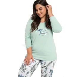 Dámské pyžamo 3016 Ariana Taro - vyrobené z vysoce kvalitní a měkké bavlny - tričko je zelené barvy s dlouhými rukávy - ozdobené na přední straně potiskem - vzorované capri kalhoty