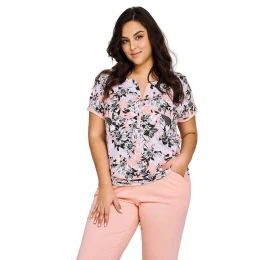 Dámske pyžamo 3131 Lana TARO - vyrobené z kvalitnej bavlny - ružové tričko s krátkymi rukávmi - s kvetinovým motívom - zapínanie na gombíky - jednofarebné nohavice s vreckami Zloženie materiálu: 100% bavlna