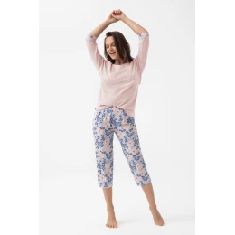Dámske pyžamo Luna 343 J/25 je kombináciou klasického a moderného dizajnu. Jednofarebný (vresový alebo krémový) vrchný diel má polkruhový výstrih a 3/4 rukávy s potlačenými pletenými manžetami, ktoré nadväzujú na vzor nohavíc. 3/4 nohavice sú tiež potlačené, čo celku dodáva harmonický vzhľad. 100% bavlnený komplet zaručuje prirodzenú priedušnosť a vysokú úroveň pohodlia pri spánku. Ideálny na všetky ročné obdobia.