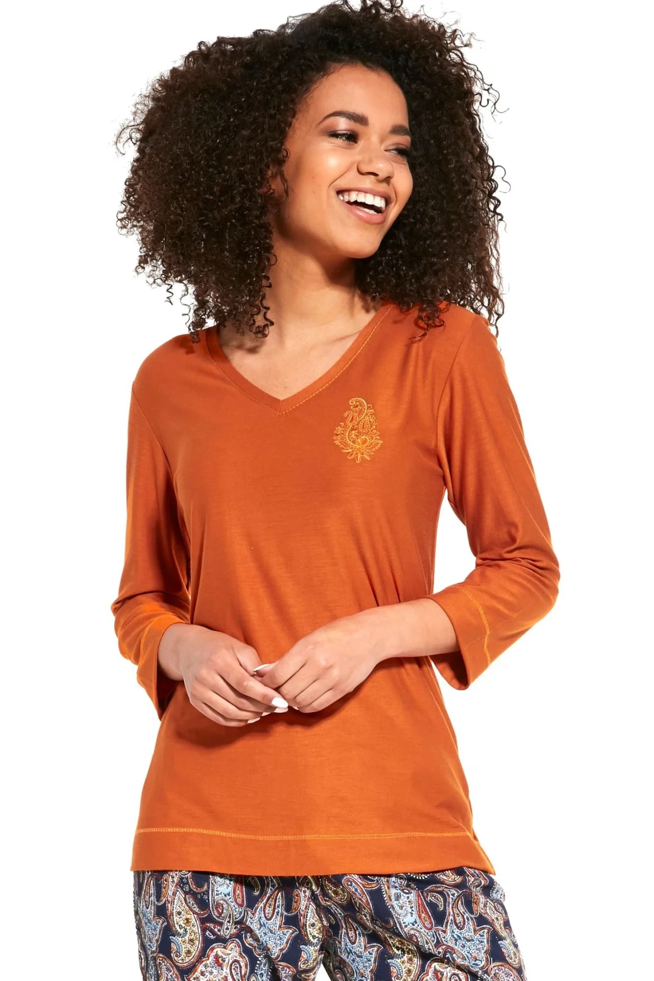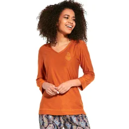 Dámské pyžamo 389/252 Ornament Cornette - bavlněný materiál je poddajný a jemný na dotek - tričko měděné barvy s dlouhými rukávy - pohodlné vzorované kalhoty - pyžamo je vhodné i na denní nošeníMateriálové složení: 100% bavlna