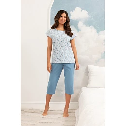 Vrchnú časť pyžama tvorí tričko s krátkym rukávom zdobené jemnou, ženskou potlačou drobných kvetov, vďaka ktorej pôsobí celok ľahko a pôvabne. 3/4 dlhé nohavice v jednotnom, teplom odtieni béžovej farby dokonale dopĺňajú súpravu a vytvárajú harmonický a štýlový celok.