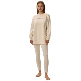 Dámske pyžamo 41870 Fune HENDERSON - vyrobené z kvalitnej bavlny - béžová mikina s dlhými rukávmi - zateplená vo vnútri - potlač na prednej strane - dlhé legíny v béžovej farbe - rukávy, nohavice a spodná časť mikiny zakončené lemom - materiálové zloženie legín: 77% bavlna + 18% polyester + 5% elastan