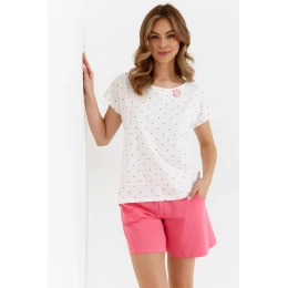 Očarujúce a pohodlné dámske pyžamo v jemnom, ženskom štýle. Blúzka v écru farbe, vyrobená z kvalitného jednoduchého džerseja s elastanom pre vynikajúcu mäkkosť a priedušnosť, je zdobená jemným vzorom drobných ružových bodiek. Nadrozmerný strih zaručuje úplnú voľnosť pohybu, zatiaľ čo krátke rukávy a okrúhly, starostlivo prešitý výstrih s vyšívanými tylovými kvetmi dodávajú šarm. K súprave sa dodávajú dlhšie šortky v ružovej farbe, vybavené praktickými vreckami. Kombinácia pohodlia a štýlu, ideálna na pokojné noci a lenivé rána.