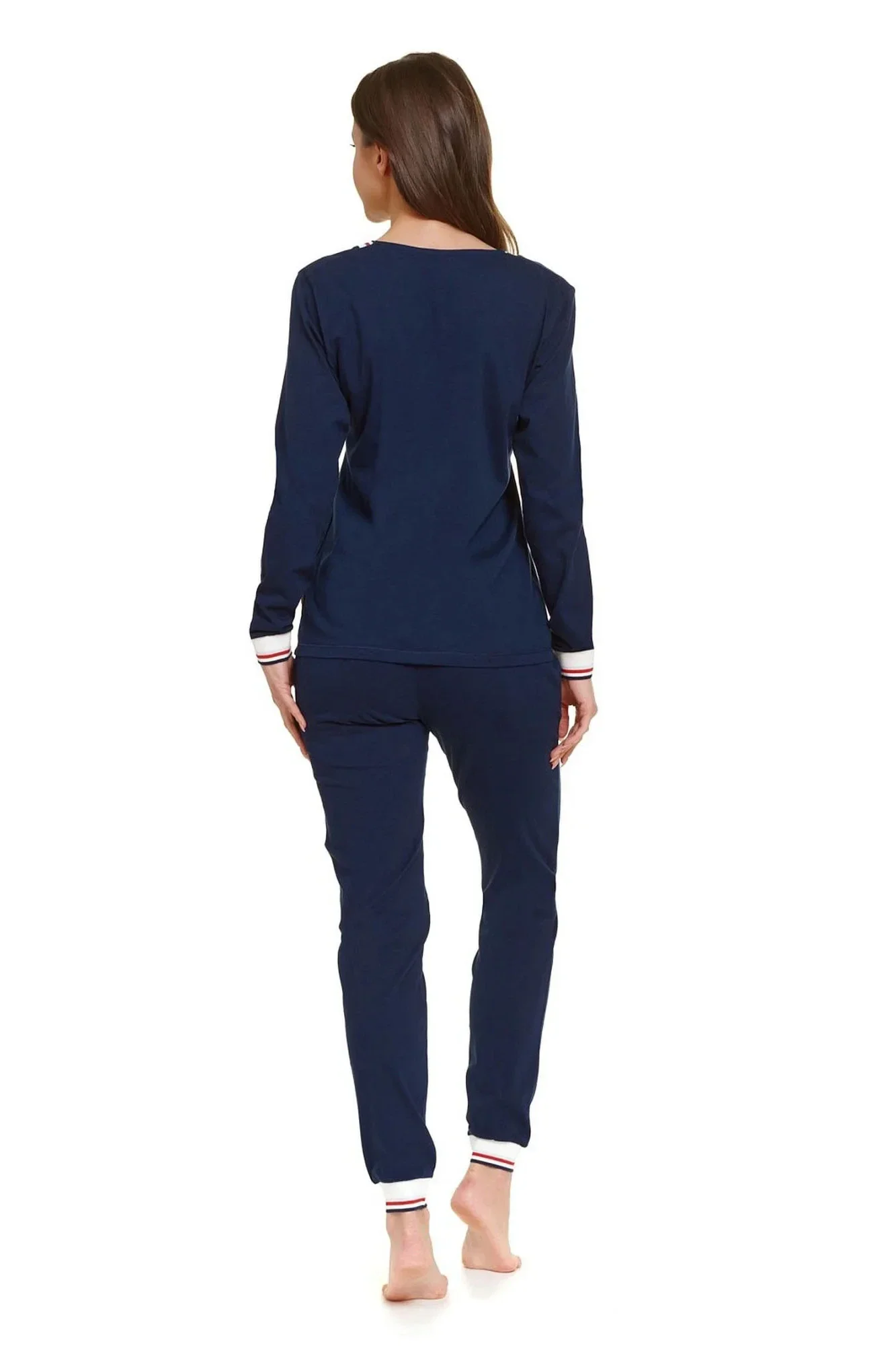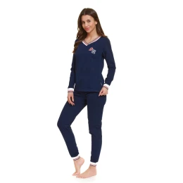 Dámske pyžamo 4504 Doctor Nap - vyrobené z veľmi kvalitnej a príjemnej bavlny - tmavo modré tričko s dlhými rukávmi - na prednej strane ozdobené potlačou - kontrastné lemovanie manžiet a výstrihu - dlhé tmavo modré nohaviceMateriálové zloženie: 100% bavlna