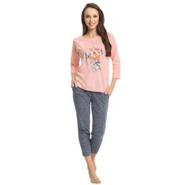 Dámske pyžamo 628 Luna - bavlnený materiál je poddajný a jemný na dotyk - lososové tričko s trojštvrťovými rukávmi - s farebnou potlačou na prednej strane - trojštvrťové vzorované nohavice majú v páse gumu - pyžamo je vhodné aj na denné nosenie