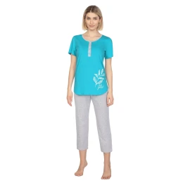 Dámske pyžamo 665 tyrkysová REGINA - vyrobené z kvalitnej bavlny - tyrkysové tričko s krátkymi rukávmi - zapínanie na gombíky - zdobené potlačou na prednej strane - pohodlné vzorované nohavice Zloženie materiálu: 100% bavlna