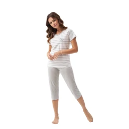Dámske pyžamo 696 sivá Luna - vyrobené z kvalitnej bavlny - biele tričko s krátkymi rukávmi - so sivými prúžkami - zdobené potlačou na prednej strane - sivé kapri nohavice - pyžamo vhodné na každodenné nosenie