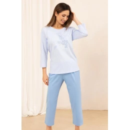 Dámske pyžamo 706 BIG J/25 je klasickou a pohodlnou voľbou určenou pre ženy, ktoré oceňujú prírodné materiály a jemný štýl. Je vyrobené z kvalitnej 100 % bavlny, ponúka úplnú voľnosť pohybu a vynikajúcu priedušnosť. Košeľu s 3/4 rukávmi a polkruhovým výstrihom zdobí na prednej strane jemná potlač, ktorá jej dodáva ženský charakter. Celok dopĺňajú pevné nohavice s dĺžkou 7/8, ktoré sú ideálne na teplejšie dni a večery.