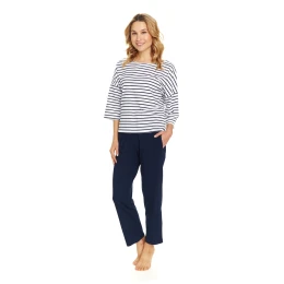 Dámske pyžamo 7122 Doctornap - vyrobené z kvalitnej bavlny - biele tričko s krátkymi rukávmi - s modrými prúžkami - potlač na prednej strane - modré šortky s vreckami - certifikát OEKO-TEX Standard 100