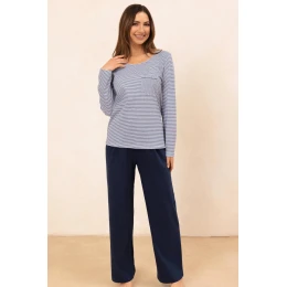 Dámsky pyžamový komplet 715 BIG J/25 je klasická súprava nočného oblečenia z vysokokvalitnej 100 % bavlny. Nadčasové pruhované tričko s dlhými rukávmi a okrúhlym výstrihom zaručuje pohodlie a jednoduché nosenie. Dodatočné vrecko vo výške hrudníka mu dodáva šarm a funkčnosť. K súprave patria dlhé jednotné nohavice s elastickým pásom lemovaným bavlnou, ktorý zaručuje pohodlné nosenie bez otlakov. Vďaka prírodnému materiálu je súprava ideálna na večerné spanie a relaxáciu doma.