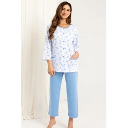 Dámske pyžamo 723 BIG J/25 je kombináciou pohodlia, ženského štýlu a funkčnosti. Je vyrobené z kvalitnej 100 % bavlny, je mäkké na dotyk, priedušné a ideálne na všetky ročné obdobia. Vrchnú časť súpravy tvorí košeľa na gombíky so 7/8 rukávmi, zdobená kvetinovou potlačou a vybavená praktickými vreckami na bokoch. Súpravu dopĺňajú hladké nohavice s dĺžkou po členky a elastickým pásom pre pohodlné nosenie.
