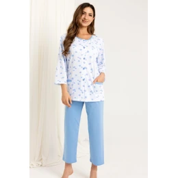 Dámske pyžamo 723 J/25 je kombináciou pohodlia, ženského štýlu a funkčnosti. Je vyrobené z kvalitnej 100 % bavlny, je príjemné na dotyk, priedušné a ideálne na všetky ročné obdobia. Vrchnú časť súpravy tvorí košeľa so 7/8 rukávmi, zapínaná na gombíky, zdobená kvetinovou potlačou a vybavená praktickými vreckami na bokoch. Súpravu dopĺňajú hladké, dlhé nohavice po členky s elastickým pásom pre pohodlné nosenie.