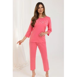 Dámske pyžamo 724 BIG J/25 je ideálnou voľbou na teplejšie noci a každodenný domáci relax. Je vyrobené z kvalitnej 100 % bavlny, ktorá zaručuje pohodlie a priedušnosť. Tričko s 3/4 rukávmi, polkruhovým výstrihom a ozdobnou potlačou na prednej strane pôsobí štýlovo a žensky, dopĺňa ho pevná 7/8 nohavica, ktorá vďaka klasickému strihu zaručuje úplnú voľnosť pohybu a pohodlné nosenie.