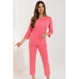 Dámske pyžamo 724 J/25 je ideálnou voľbou na teplejšie noci a každodenný domáci relax. Je vyrobené z vysokokvalitnej 100 % bavlny, ktorá zaručuje pohodlie a priedušnosť. Tričko s 3/4 rukávmi, polkruhovým výstrihom a ozdobnou potlačou na prednej strane pôsobí štýlovo a žensky, dopĺňa ho jednofarebná 7/8 dĺžka nohavíc, ktorá vďaka klasickému strihu zaručuje úplnú voľnosť pohybu a pohodlné nosenie.