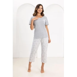 Komfortowa piżama damska zaprojektowana z myślą o wygodzie i swobodzie ruchów. Zestaw składa się z jednokolorowej koszulki z krótkim rękawem oraz spodni o długości 3/4 ozdobionych subtelnym wzorem. Delikatna, pastelowa kolorystyka nadaje całości spokojny i kobiecy charakter. Prosty, luźny krój zapewnia komfort noszenia zarówno podczas snu, jak i codziennego wypoczynku w domu. Piżama doskonale sprawdzi się przez cały rok, szczególnie w cieplejsze dni.