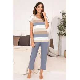 Pohodlné dámske pyžamo s klasickým, univerzálnym štýlom, určené na každodenný relax. Súprava sa skladá z trička s krátkymi rukávmi zdobeného horizontálnymi pruhmi v jemných, pastelových odtieňoch a hladkých nohavíc s dĺžkou 3/4. Voľný strih zaručuje voľnosť pohybu a pohodlie pri nosení počas celej noci. Harmonická farebnosť dodáva celku pokojný, elegantný charakter, vďaka čomu je pyžamo ideálne na spanie aj na domáci relax.