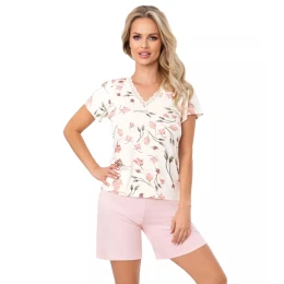 Dámske pyžamo Amaris 1/2 Donna - vyrobené z kvalitnej viskózy - s kvetinovým motívom - tričko s krátkym rukávom - výstrih zdobený čipkou - ružové šortky