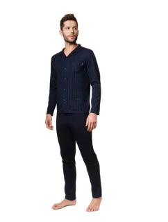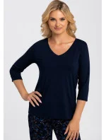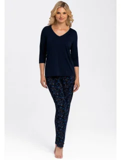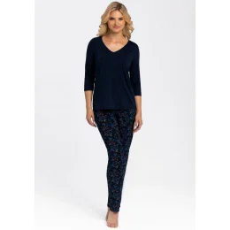 Elegantné dámske pyžamo od značky Babella. Pyžamo je vyrobené z vysoko kvalitnej viskozy. Vrchný diel má 3/4 rukávy a výstrih do "V". Spodný diel je dlhý, vzorovaný a bez úpletov.