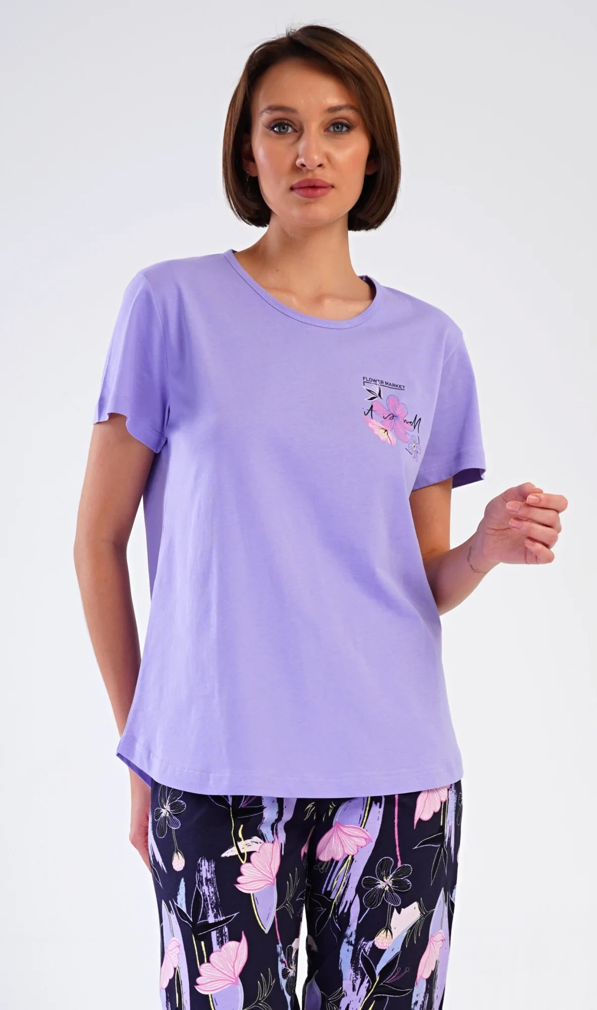 Dámske bavlnené capri pyžamo Flowers. Pyžamo sa skladá z trička s krátkym rukávom a trojštvrťových nohavíc. Tričko s okrúhlym výstrihom má na hrudi obrázok kvetu. Tento motív sa opakuje na nohaviciach, ktoré majú elastický pás a šnúrku na stiahnutie a sú bez vreciek. Použitý bavlnený materiál je príjemný a pružný na dotyk.
