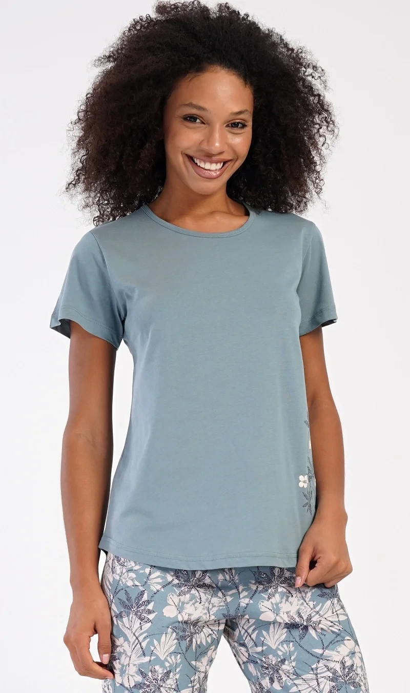 Dámske bavlnené capri pyžamo Francesca. Pyžamo sa skladá z trička s krátkym rukávom a trojštvrťových nohavíc. Tričko s okrúhlym výstrihom zdobí obrázok kvetov. Tento motív sa opakuje aj na nohaviciach, ktoré majú elastický pás a šnúrku na stiahnutie a sú bez vreciek. Použitý bavlnený materiál je príjemný a pružný na dotyk.