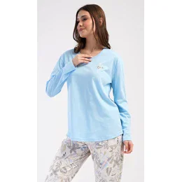 Dámske bavlnené dlhé pyžamo Alex. Pyžamo sa skladá z trička s dlhým rukávom a dlhých nohavíc. Tričko je jednofarebné, na hrudi ho zdobí obrázok malého listu. Motív listu sa opakuje aj na nohaviciach, ktoré majú elastický pás a šnúrku na stiahnutie, ale nemajú vrecká. Použitý bavlnený materiál je pružný a príjemný na dotyk.