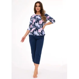 Dámske pyžamo Cornette z priedušnej a mäkkej bavlny ideálne na pohodlné nosenie a spánok. Tričko má 3/4 rukávy a okrúhly výstrih lemovaný ozdobnou páskou. Kvetinová potlač dodáva ženský vzhľad. Nohavice sú jednofarebné, jednofarebné, v dĺžke 7/8, ktorá poskytuje pohodlie a voľnosť. Súprava je zabalená v darčekovej krabičke a je vhodná ako darček.