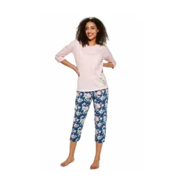 Dámske pyžamo Cornette má top s dlhými rukávmi a 3/4 vzorované nohavice. Vrchný diel má okrúhly výstrih a v spodnej časti potlač.