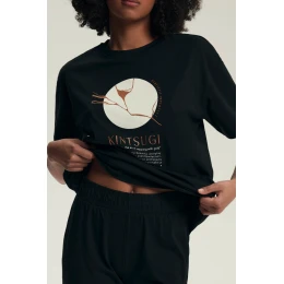 Zestaw składa się z luźnego T-shirtu z krótkim rękawem oraz spodni o długości 3/4 z elastyczną talią, które zapewniają wygodne dopasowanie bez ucisku. Całość w eleganckim, czarnym kolorze sprawdzi się nie tylko jako piżama, ale również jako stylowa odzież domowa.