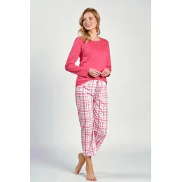 Dámske pyžamo s dlhými rukávmi, jednofarebné, s figurínou na gombíky na úrovni hrudníka. Vzorované nohavice so 7/8 dĺžkou nohavíc.